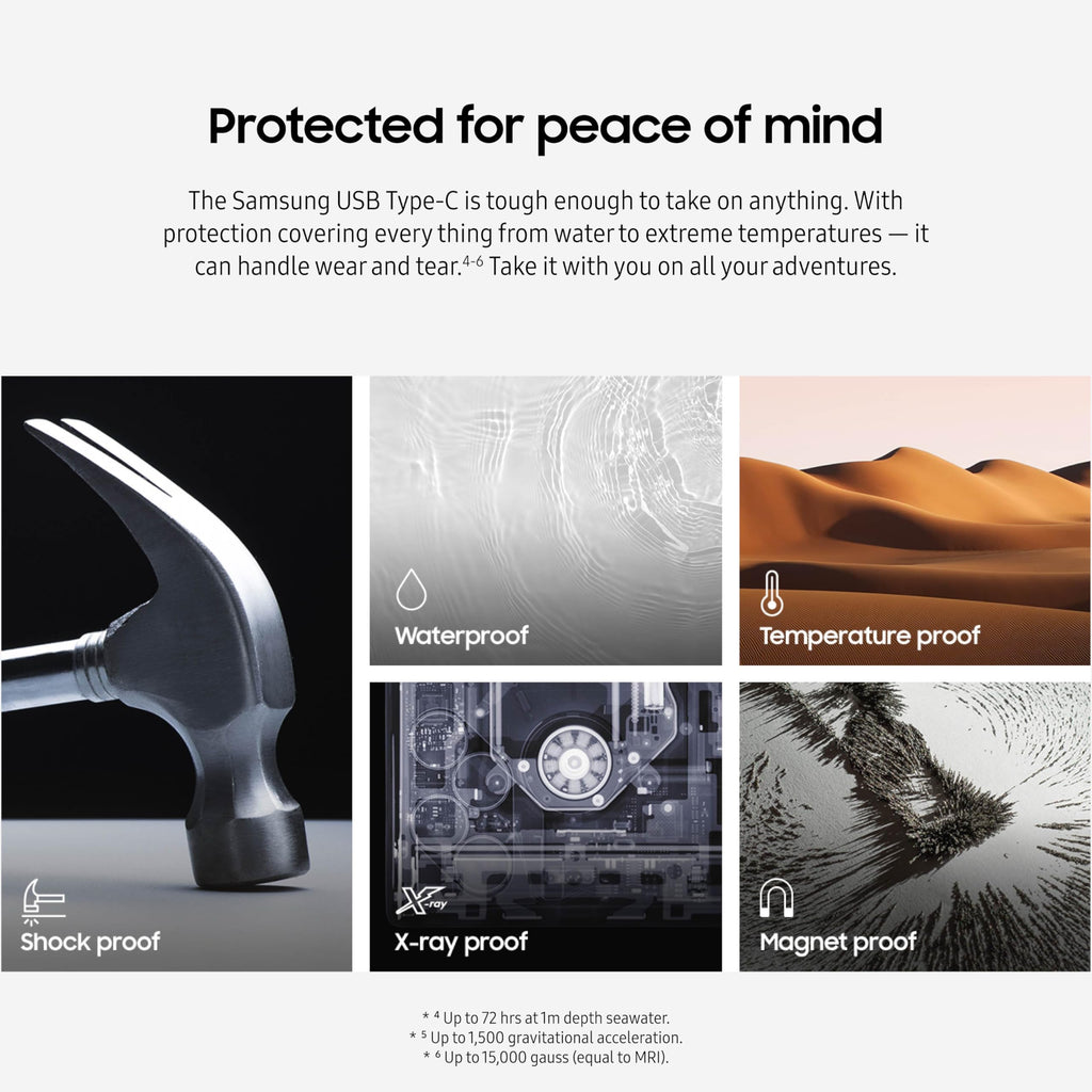 - TOUGH & TRUSTED***: Files stay secure, no matter the terrain; Samsung's flash memory technology makes the Type-C a trustworthy drive to store your valuable data; It's waterproof, shock-proof, magnet-proof, temperature-proof, and X-ray-proof body, plus it's backed by a 5-year limited warranty