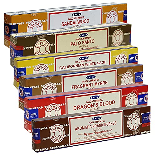Details: Incense and holder set #10: This is a bundled product that includes 6 classic fragrances in Satya incense sticks and incense holder. Incense sticks variety pack includes Sandalwood|Dragon's Blood|Palo Santo|Californian White Sage|Fragrant|Aromatic fragrances. Gift Set: Total 6 fragrances. 15 incense sticks of each fragrance. Incense holder is also included. Inciensos aromaticos - Incenses are popular in almost every culture. Traditionally incenses were used for religious and sprituality purposes. Agarbatti Sticks - Our incense sticks are non toxic all natural organic and herbal. All incense are handcrafted in India according to traditional customs using minimal tools and almost no machinery.