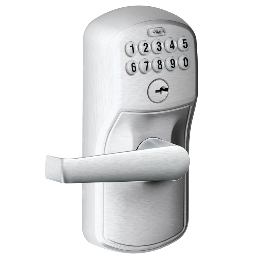 Plymouth, satin chrome finish light commercial electronic keypad entry lock, exterior with elan lever, switch between unlocked or automatic re-locking, fits most standard door Preps, 9V battery operation, keypad illuminates so you can see it at night, bhma grade 2, visual pack. This product adds a great value. Product is highly durable and very easy to use. This product is manufactured in china. Easy installation, no need to run wires.