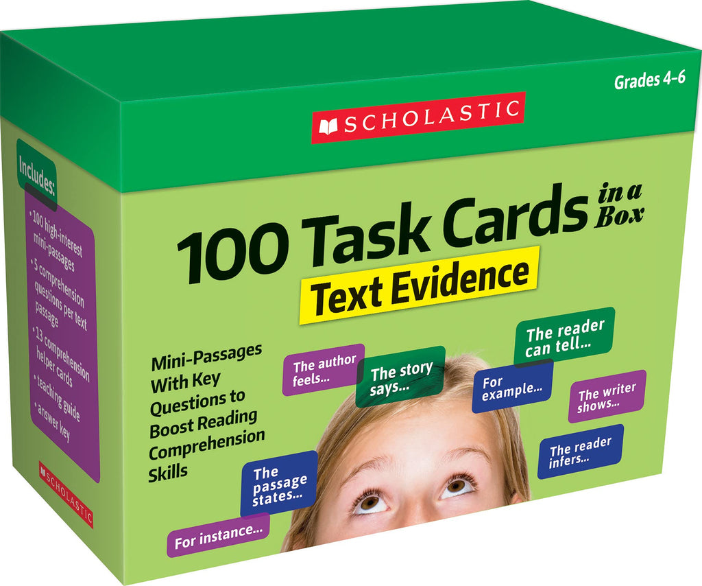 Details: Finding text evidence is a very important skill all students are expected to master. This collection of ready-to-use task cards can help! Each card features high-interest short passages with five comprehension questions that prompt students to identify and effectively cite text evidence across a variety of genres. Also includes comprehension-helper cards that provide kid-friendly definitions, tips, and examples to help students master reading skills. Includes box with 120 cards.