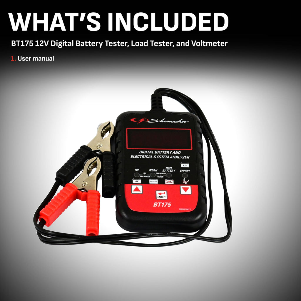 - IN THE BOX: Schumacher BT-175 12V Digital Battery Tester, Load Tester, and Voltmeter and user manual