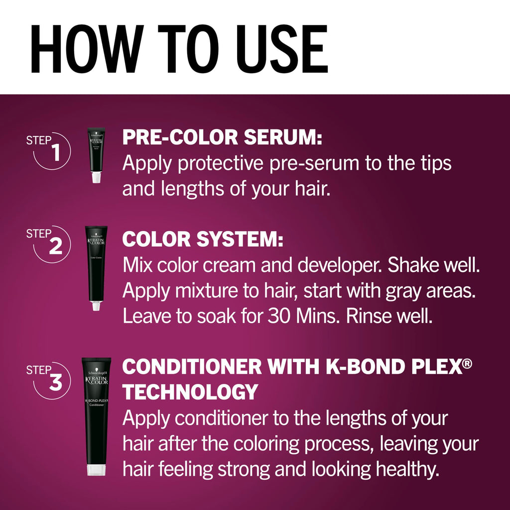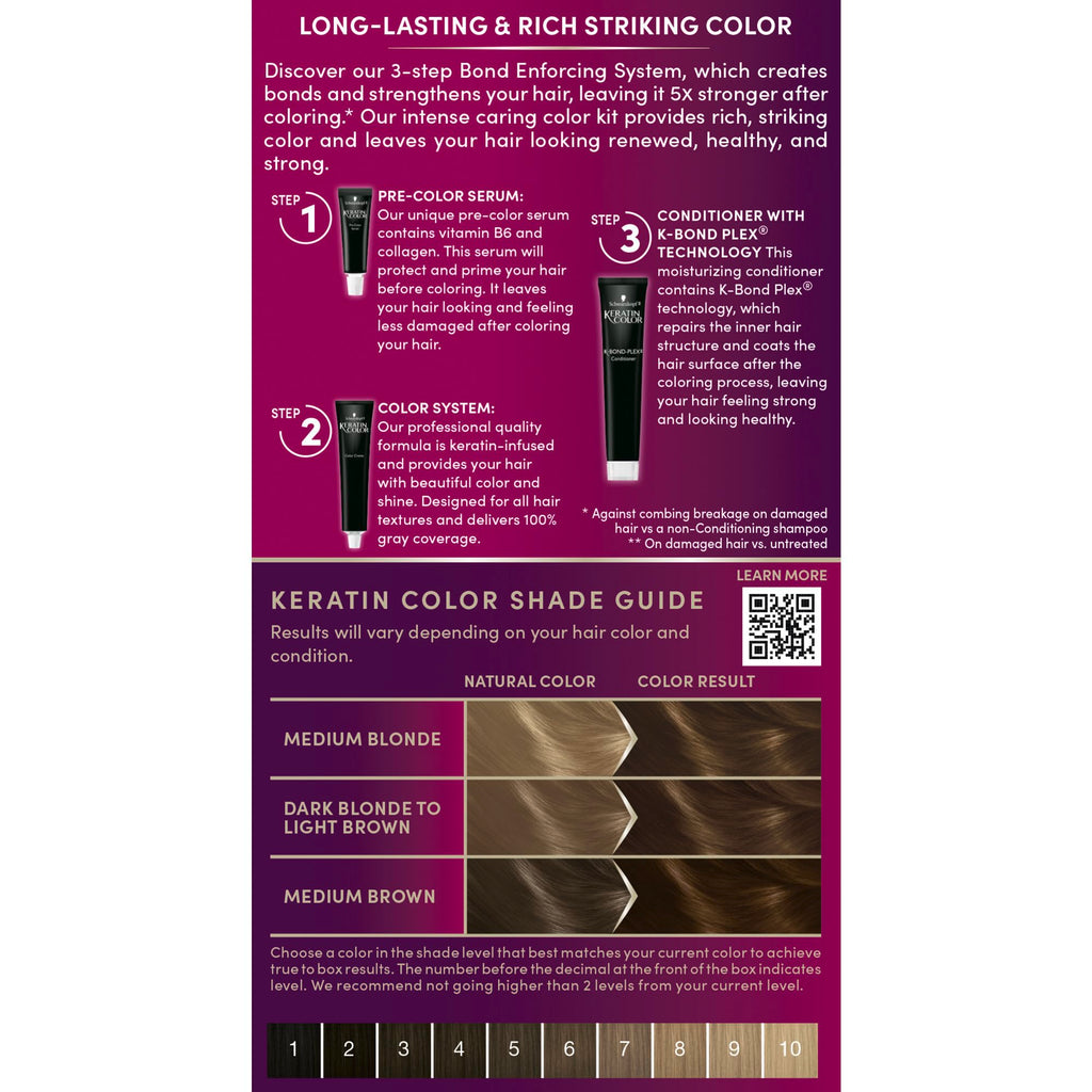 Details: Schwarzkopf Keratin Color Permanent Hair Dye Color Cream, 6.0 Delicate Praline - Salon-inspired hair color for womenThis permanent hair dye provides rich, striking color on all hair textures - with minimal damage*. The Keratin hair color formula was developed with professionals to provide salon-quality hair color and brilliant shine. In addition, our 3-step Bond Enforcing System creates bonds and strengthens your hair, leaving your hair 5x stronger** after coloring. Keratin Color also reduces frizz by providing humidity resistance for 72 hours.*** Our pre-color serum containing Vitamin B6 and Collagen, primes the hair. We recommend repeating the application of the hair dye in tube every 4 weeks for even color from root to tip.Established 1898, Schwarzkopf has 125+ years of hair expertise, providing salon inspired hair color at home.The product benefits at a glance: Leaves hair 5x stronger**