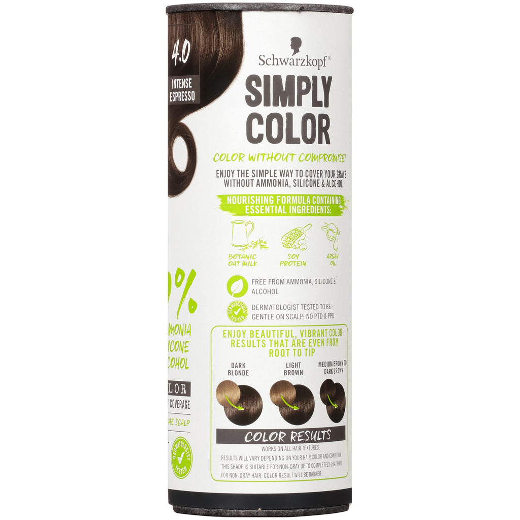 Details: Schwarzkopf Simply Color 4.0 Intense Espresso Brown hair color cream - natural-looking, vibrant hair color without PPD, PTD and ammonia.Looking for vibrant permanent hair color without the harsh ingredients? This dermatologist-tested hair dye without ammonia is gentle to skin but gives natural-looking espresso brown hair color with up to 100% gray coverage. The hair color kit includes a conditioner, for hair that looks healthy after coloring. Suitable for all hair textures, this brown hair dye in an intense espresso shade allows you to get natural color results at home. For best results, use the hair dye kit every 4-6 weeks.By using FSC-certified paperboard for this carton, Schwarzkopf supports sustainable packaging initiatives. This carton is 100% recyclable. Carton lids are compostable. Please recycle.The product benefits at a glance: