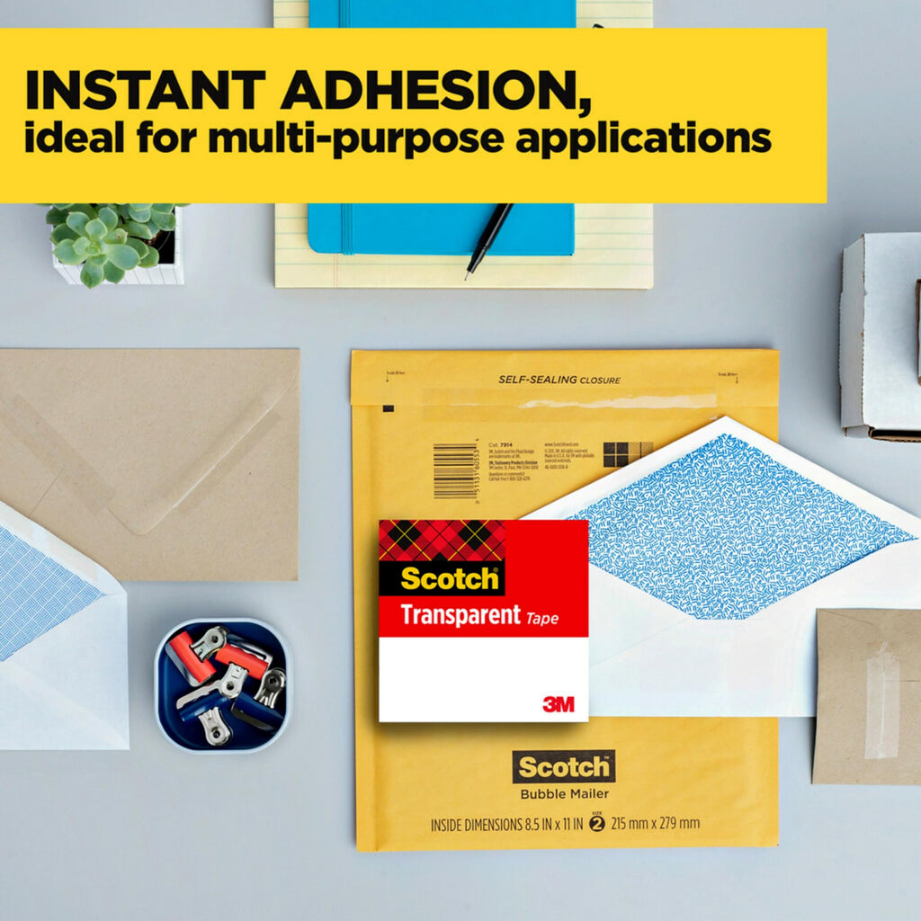 When you have a million and one things to do, there's one tape to get Scotch Transparent Tape. It's clearly strong holds things together in an instant; keeps things together for a long time. Clearly multi purpose ideal for all the jobs you need to get done. And clearly...clear using 3M adhesive technology, it goes on transparently and won't yellow with age. Scotch Transparent Tape Refills fit into all standard dispensers, glide off the roll smoothly, and cut easily without wasted tape. Whatever you need to get done, wherever you are home, work or school Scotch Transparent Tape Refill Rolls are clearly ready to go to work.