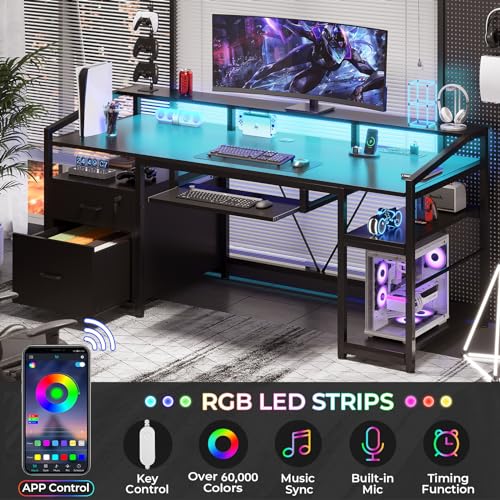 - 【What can you get?】 Computer desk comes with a file drawer for Legal/Letter/A4 size files, a small lockable drawer, a power outlet, an LED light, a keyboard tray, a printer storage space, an extra long monitor stand that can hold 3 monitors, 2 storage shelves, and CPU stand. An ideal office desk for small rooms to create excellent home office space.