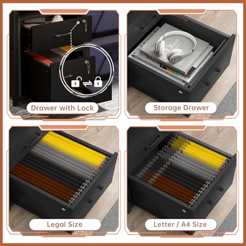 - 【Ample Storage Space】Desk comes with a file drawer, lockable small drawer, printer cabinet, and 2-tier storage shelves, with powerful storage space. The file drawer can hold Letter/Legal/A4 size files. The lockable drawer can help you privately and efficiently store supplies. This solid-constructed computer desk could hold printers and any other office machines, keeping printer or scanner within easy reach of your desk to free up workspace, saving the budget for a printer stand.