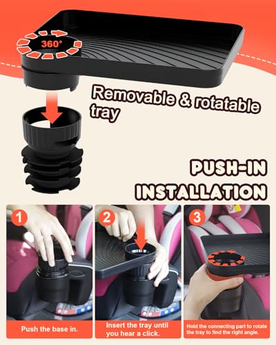 - 【Large Rotatable & Removable Tray】Enjoy a spacious tray that can hold a single hamburger meal, allowing you to eat and play without feeling cramped. Tray edges are 1'' high to prevent spills. And the car seat tray supports rotation for easy placement of your kid in the seat, as well as disassembly for convenient use and cleaning.