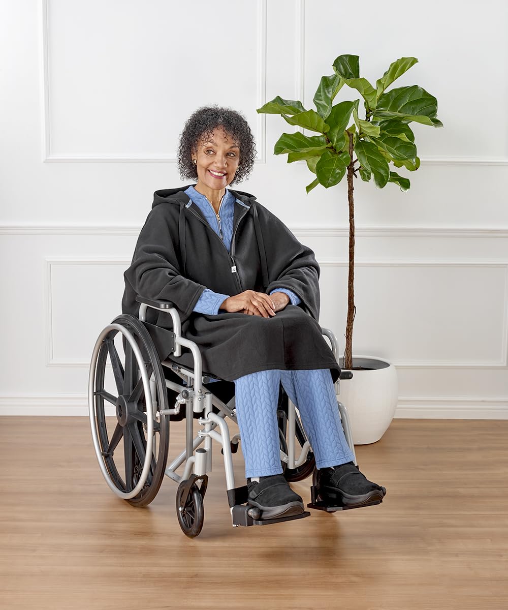 - EASY ACCESS DRESSING: This wheelchair blanket and shoulder cape, also known as a polar fleece poncho, includes a front zipper that extends to the waist, allowing for easy access for both self-dressing and assisted-dressing. Seniors who are wheelchair bound or physically limited can cover themselves with this wheelchair cape from the seated position.