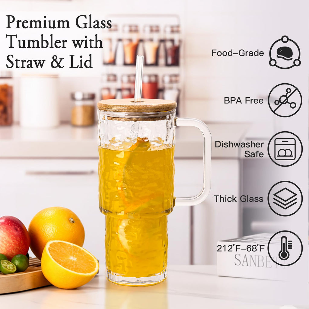 - 【Travel-Friendly & Easy to Clean】Ergonomic tumbler with handle, wide-mouth design, and dishwasher-safe glass cup with lid make it practical for commuting, office, or home. Fits most car cup holders—an ideal glass tumbler with lid for on-the-go convenience.