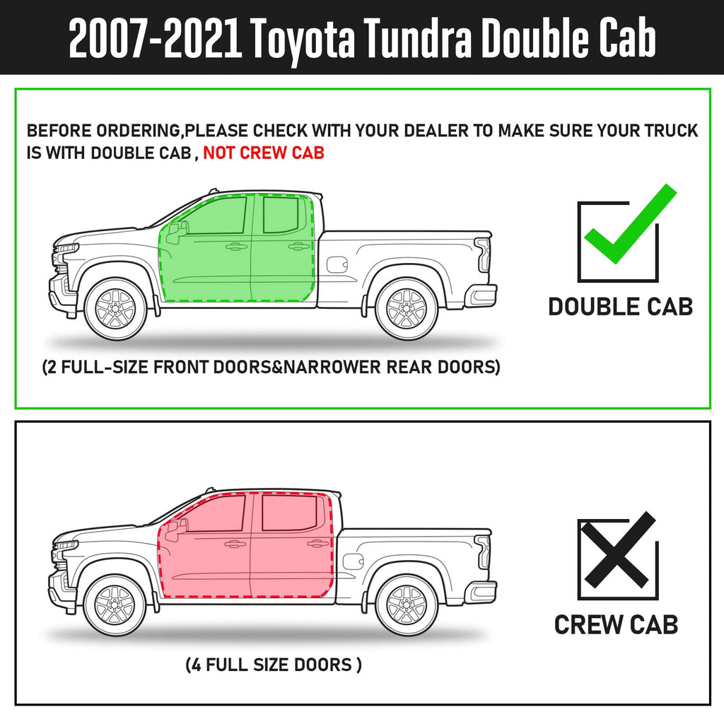 - FITMENT: Truck running boards compatible with 2007-2021 toyota tundra double cab( 2 narrow rear doors). Does not compatible with 2022-2024 tundra or crew cab(4 full-size doors).