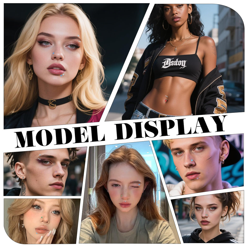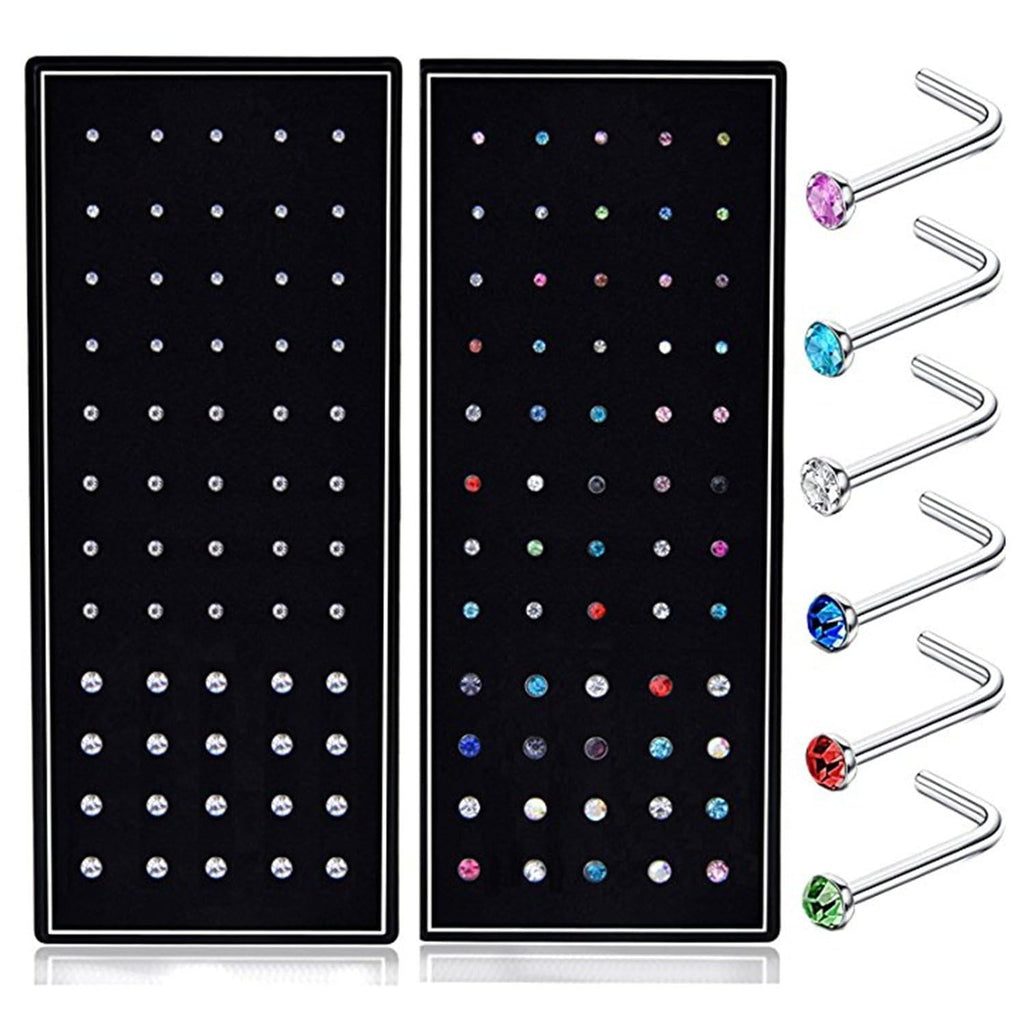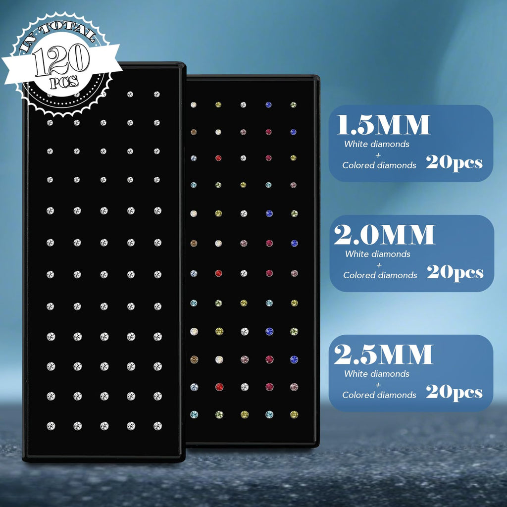 - 3.Including 3 sizes two colors nose stud rings:40pcs 1.5MM(20Pcs Clear+20Pcs Color),40pcs 2mm(20Pcs Clear+20Pcs Color),40pcs 2.5mm(20Pcs Clear+20Pcs Color) crystal studs