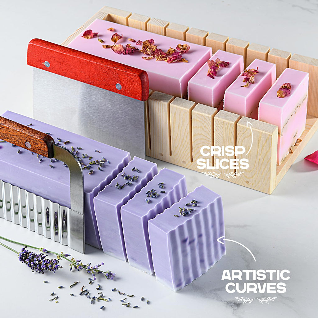 - 2.ALL INCLUSIVE SET: Our set includes all the parts you may need. 4 lbs of soap base, 6 captivating fragrances, 6 vibrant dye liquids, 10 stirring sticks, 2 stainless steel cutters, soap mold loaf with silicone mold, pouring pitcher, soap cutting box, assorted silicone molds, 25 soap wrappers for elegant presentation, Rose and Lavender petals for exquisite embellishments, craft twine and 50 shrink packaging bags.