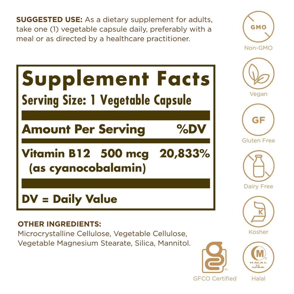 - Gluten, Wheat & Dairy Free; Solgar Vitamin B12 is non-GMO, vegan, kosher, halal, and free of: gluten, wheat, dairy, soy, yeast, sugar, sodium, artificial flavor, preservatives, and color