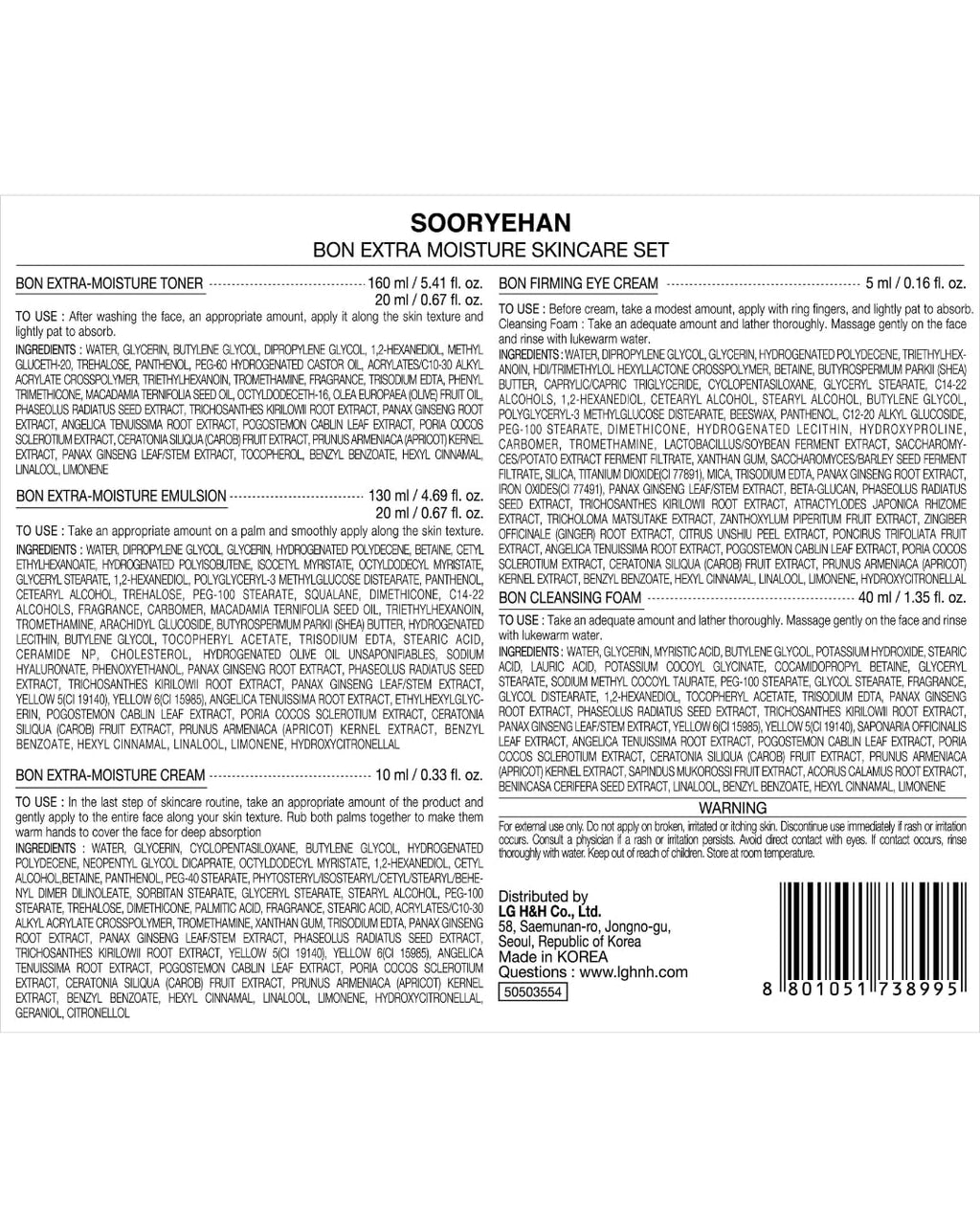 Details: SOORYEHAN BON EXTRA MOISTURE SKINCARE SET - Toner, Emulsion Lotion, Cleansing Foam, Cream, Eye Cream, Luxury Premium High-end Hydrating Korean Skincare Gift Set