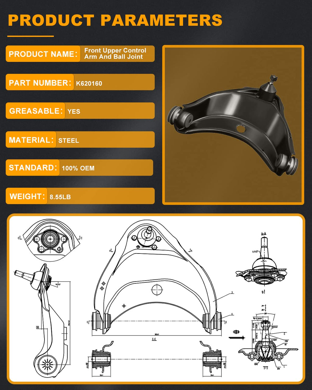- List: This Kit Contain 15Pcs Chassis Parts (1 Front Upper Left Control Arm and Ball Joint + 1 Front Upper Right Control Arm and Ball Joint + 1 Front Lower Right Control Arm and Ball Joint + 1 Front Lower Left Control Arm and Ball Joint + 1 Pitman Arm + 1 Idler Arm + 1 Idler Arm Bracket Assembly With Grease Hose + 2 Front Tie Rod Adjusting Sleeve + 2 Front Outer Tie Rod End + 2 Front Inner Tie Rod End + 2 Front Sway Bar End Link)