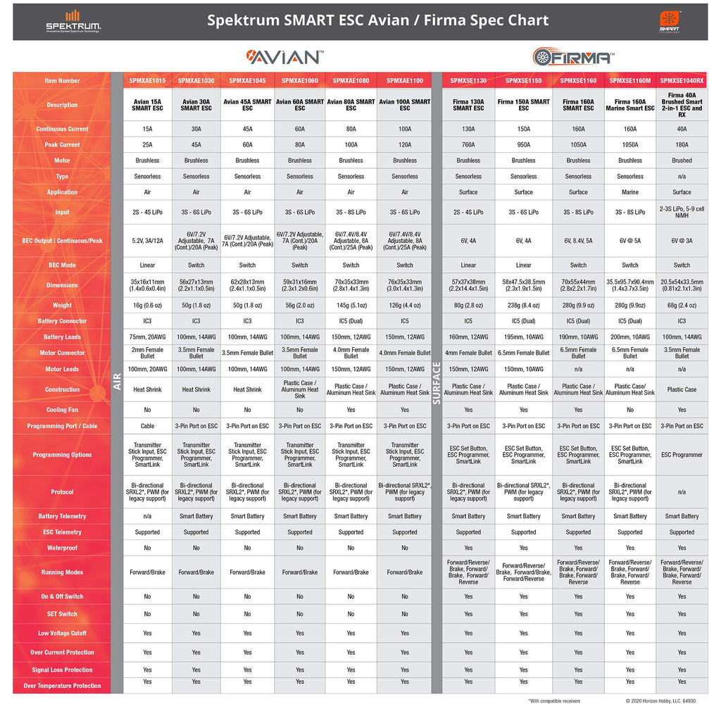 Details: Upgrade your brushed motor equipped models to Spektrum Smart Technology with the Firma Smart 40 Amp Brushed ESC. Get valuable battery and ESC telemetry data easily and in real time right on your Smart-compatible Spektrum transmitter — including motor current, input voltage, remaining battery capacity and other information that will help endurance RC trailers increase efficiency and extend battery life and run time. Built with Crawler and Scaler models in mind, the Firma 40 Amp Brushed ESC features a waterproof and dust proof design to keep you going down the trail in nearly any conditions. It has a powerful 3 amp BEC for your lights, winch and steering servo. And it’s fully programmable using an optional programmer box, so you can customize the ESC to suit your model’s needs and your own driving style. The Firma 40 Amp Brushed ESC also helps reduce clutter and streamline your setup with an industry-leading, integrated 4-channel DSMR/DSM2 receiver. This integrated receiver system is perfectly suited to allow drivers the options for winch setups, dual steering mixes and more. And setup is simple, with a convenient bind button and no complicated calibrations. When using Smart telemetry, alarms and parameters are setup automatically on your Spektrum transmitter