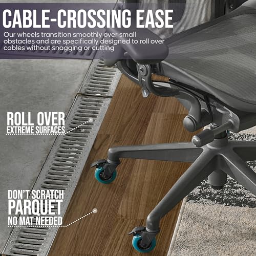 - SMOOTH & QUIET BARRIER-FREE ROLLING: High-tech elastic urethane of our office chair wheels makes movements easy and noiseless. This chair castor will glide smoothly and not scratch your hard wood floors