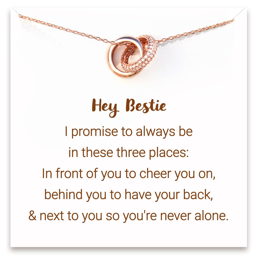 - CARD MESSAGE: "Hey Bestie I promise to always be in these three places: In front of you to cheer you on, behind you to have your back, and next to you so you're never alone." It's the perfect gift for friend, sisters, bffs, and besties.