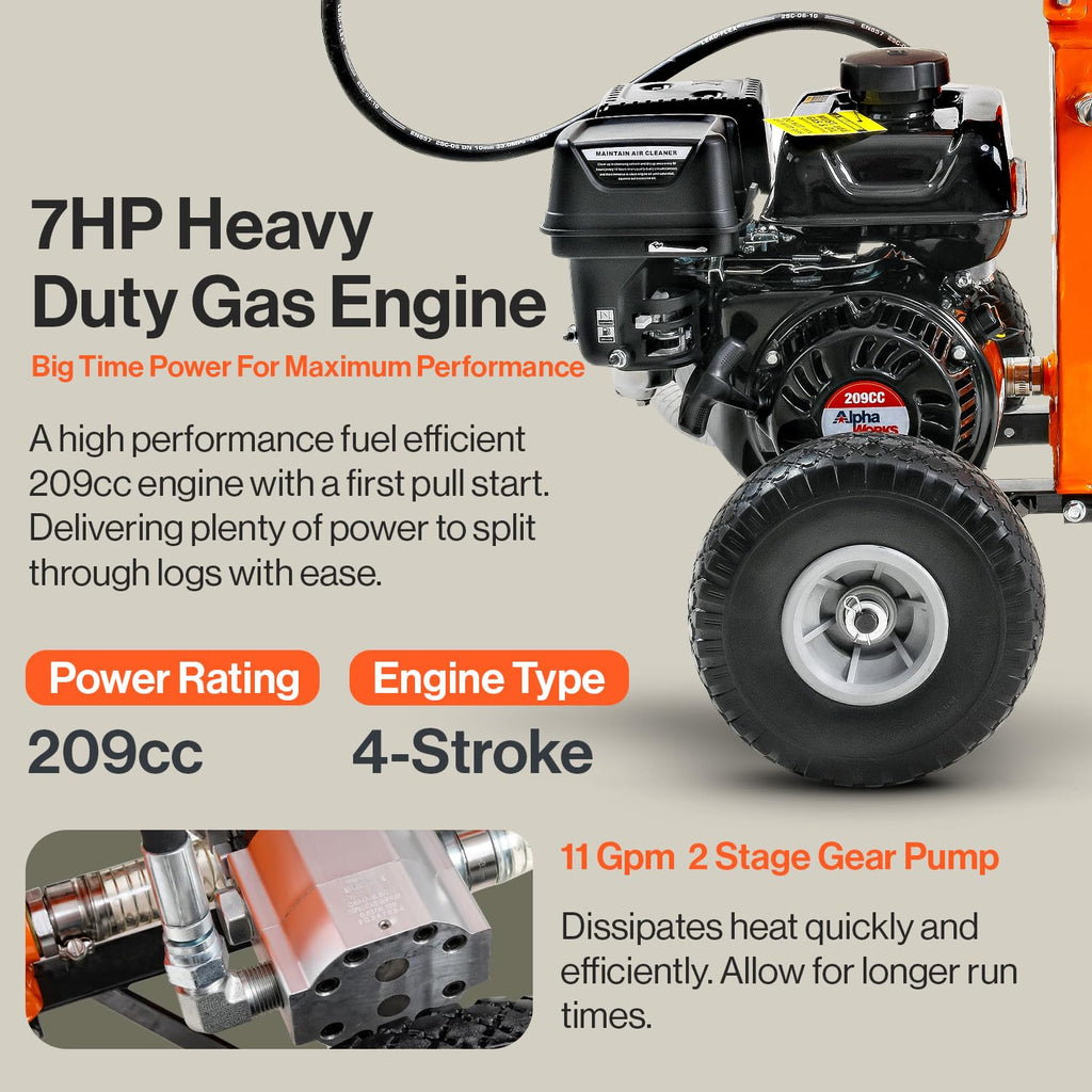 - Powerful Performance - Equipped with a 7HP AlphaWorks engine and 2-Stage Bucher Hydraulic Gear Pump, our log splitter effortlessly handles logs up to 20" long and 24" in diameter.