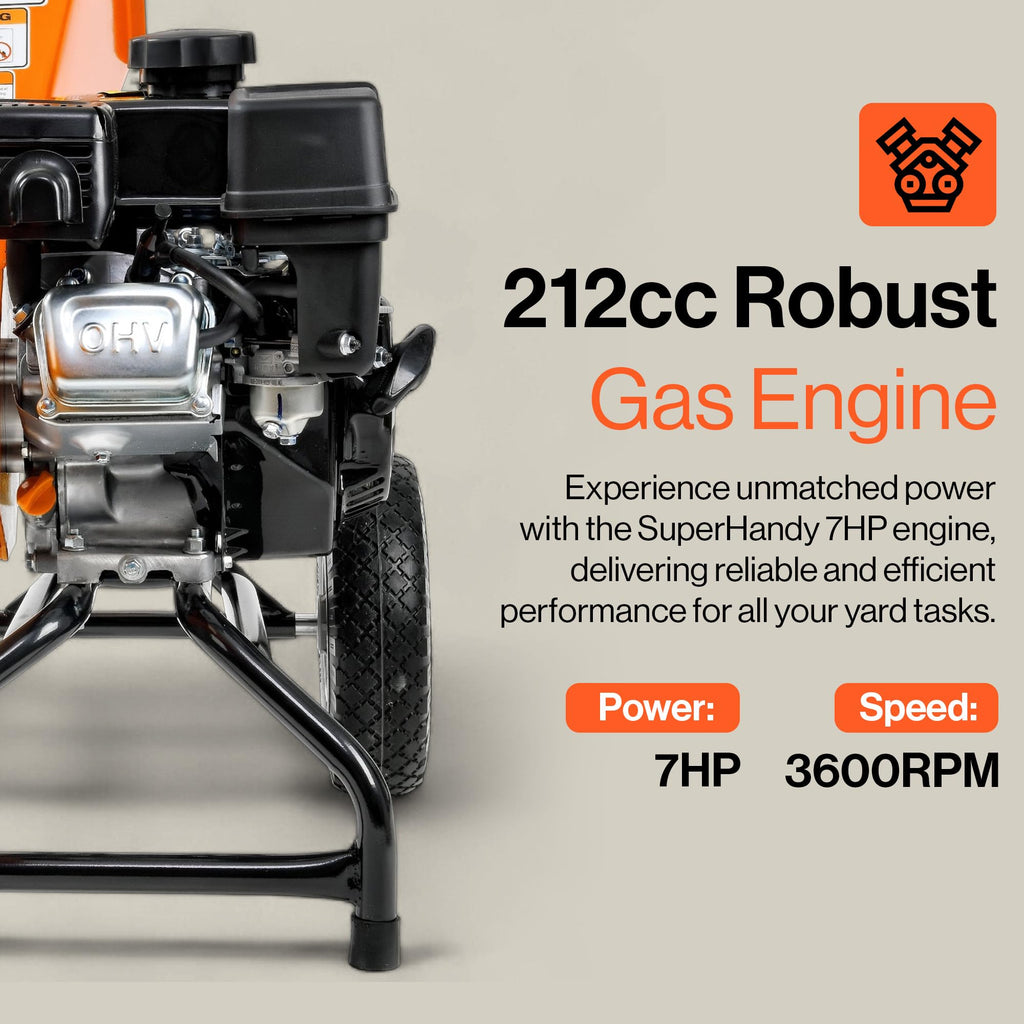 - POWERFUL - This Chippers powerful recoil starting 7HP Horizontal 4-stroke Single Cylinder OHV Gas Powered Engine, handles up to 3" diameter wood without a problem; Fuel w/ 87+ unleaded gasoline (NO ETHANOL recommended), 0.7 gallons Max capacity