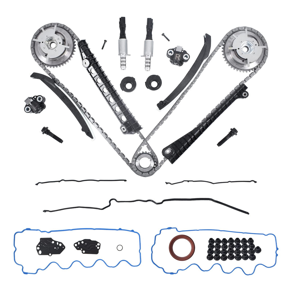 - PACKAGE INCLUDE: timing chain (122 links), cam gears / cam phasers, double row crank sprocket (21 teeth), left tensioner, right tensioner, left tensioner arm, right tensioner arm, left guide rail, right guide rail, solenoid valves, timing cover gasket set, valve cover gaskets, grommets