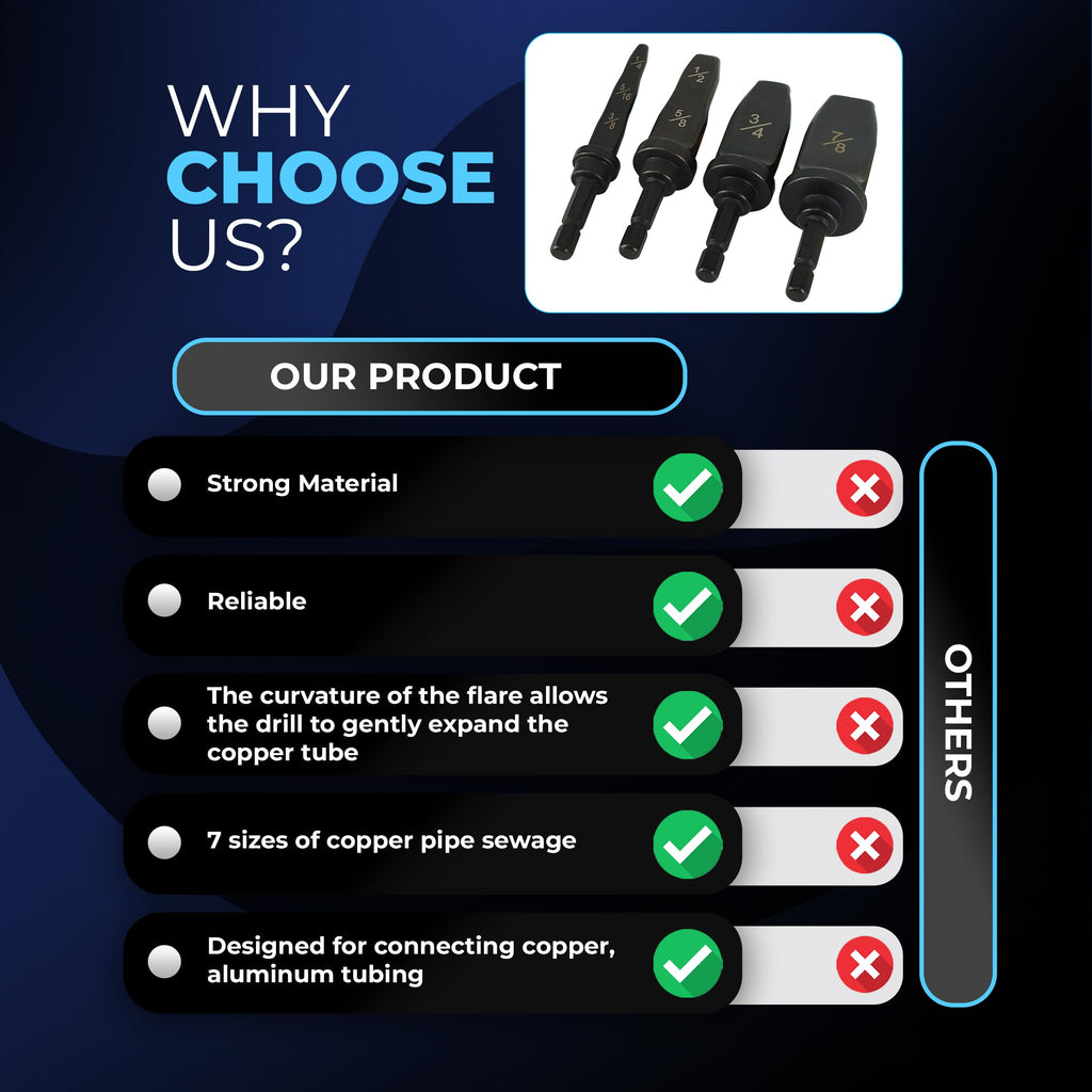 Details: This 7-Piece Swaging Tool Drill Bit Set is perfect for HVAC repairing, which is also called air conditioner manual copper tube expanding pipe swage. It can expand the inner diameter of aluminum and copper pipes. The kit includes the most commonly used sizes of 14", 5/16", 3/8", 1/2", 5/8", 3/4", 7/8" drill bits, which can meet your different needs. This is a must-have tool set for HVAC technicians, engineers, or DIY users. The swaging tool kit is made of high quality steel, with a durable and long-lasting performance. The surface is blackened and rust-proof. The swaging tool is easy to use and operate, which is an ideal choice for HVAC systems.