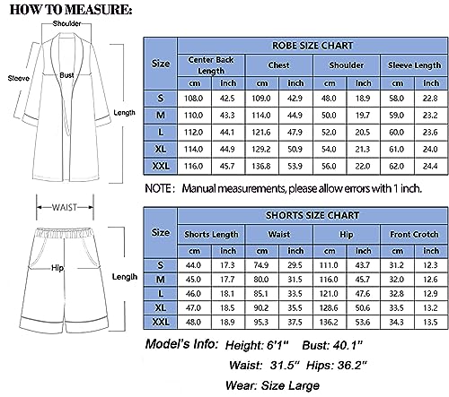 - Mens 2 PCS Silky Robe Sets: Men Kimono Bathrobe set features a knee-length, long-sleeve robe with TWO SIDE POCKETS, an adjustable/removable belt, and inside ties, easy to put on and take off. Men's Pajama Shorts with elastic waistbands to fit any body size