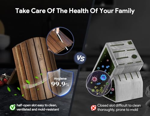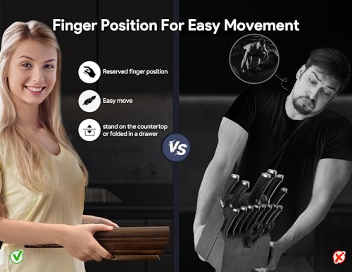 - PERFECT FOR FAMILIES WITH PETS OR KIDS: The kitchen knife set comes with a foldable stand, can be stored in a drawer to prevent children and pets from contact and injury, giving your family more peace of mind. When in use, the knife block set can stand on the countertop. Japanese-style knife set with reserved finger positions is convenient to move each time