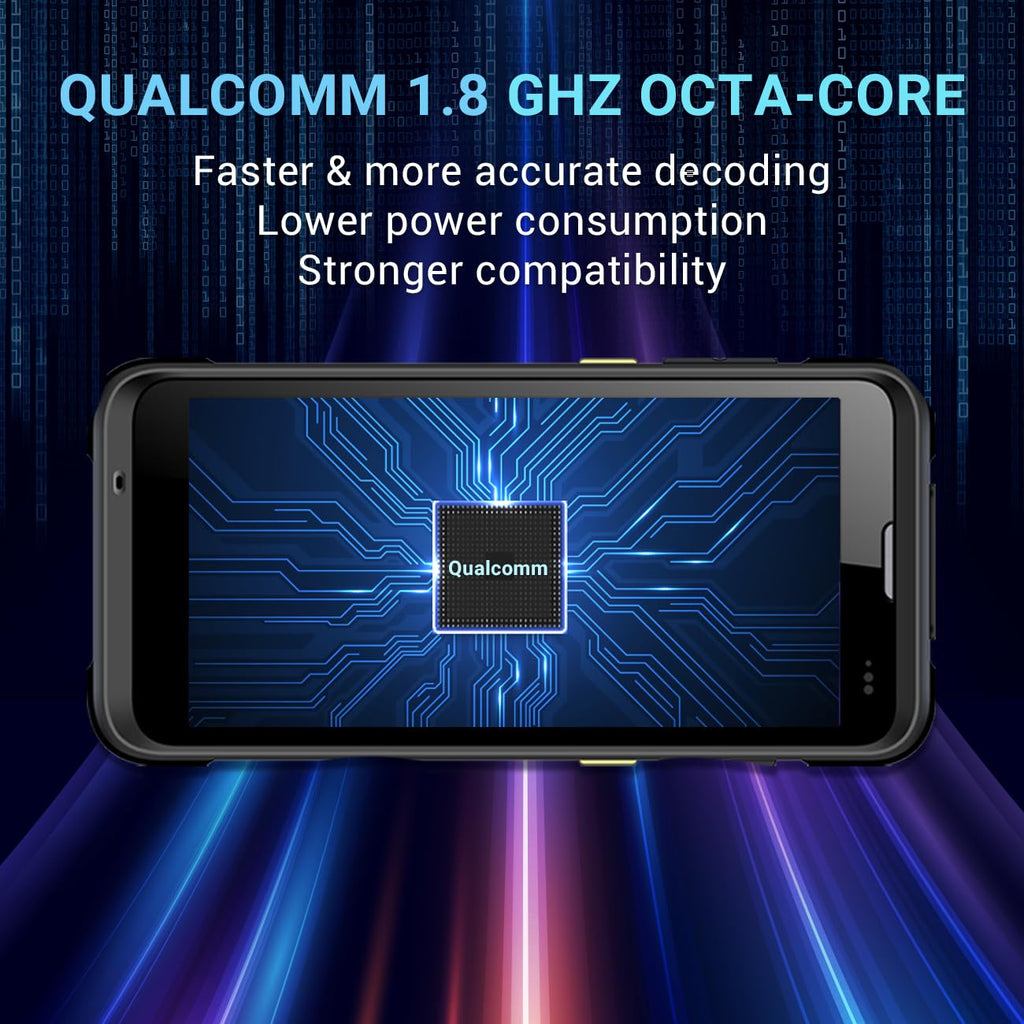 - 【Top-notch Qualcomm CPU & 5.5” HD Display】The use of Qualcomm CPU has strong performance, network stability, and application compatibility and updates are more advantageous. The rugged handheld mobile computer with a 5.5-inch HD display and NFC. The device supports quick charge and UHF sled for high extensibility. Its Android 9.0 version offers enough data throughput and security that fully satisfies the needs in logistics, warehouse, manufacturing, retail, etc.