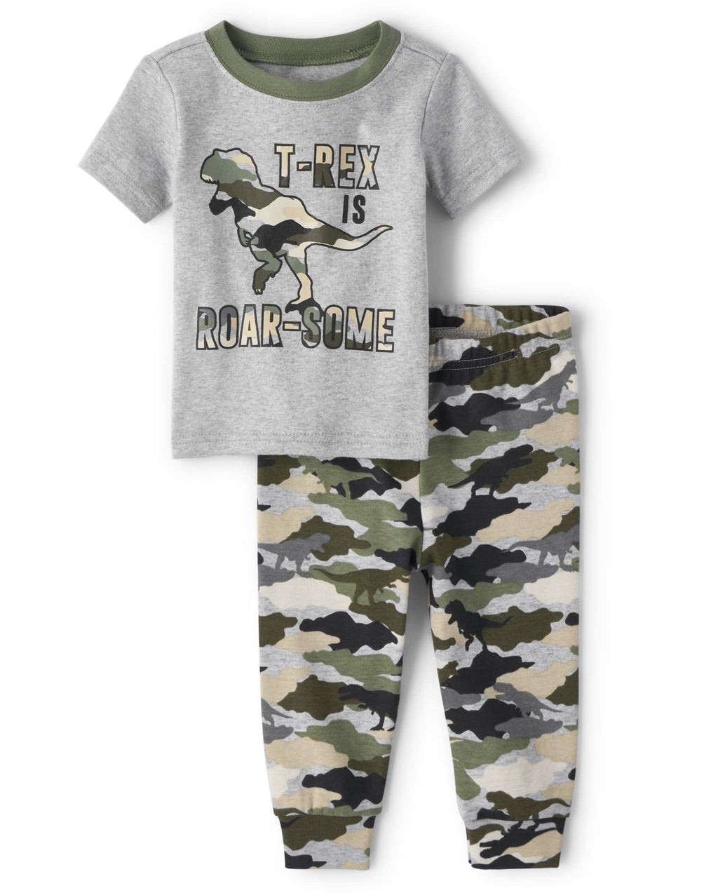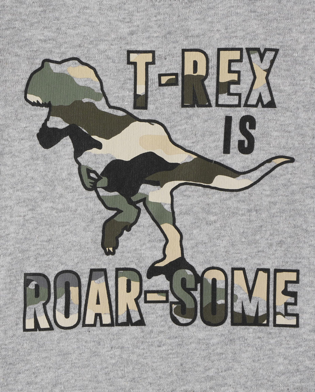 - PAJAMA TOP — Features short sleeves, contrast rib-knit crew neck and 'T-Rex Is Roar-Some' with camo dino graphic design at front