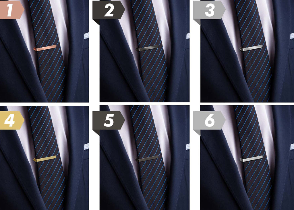 - Gorgeous Tie Clip for Men: A week's choice of 6 colors tie clips to match with tie and outfit, 3 with metallic luster, 3 are matte. These tie bars firmly hold your tie very well and also are nicely decorations on your tie, give you a business formal look.