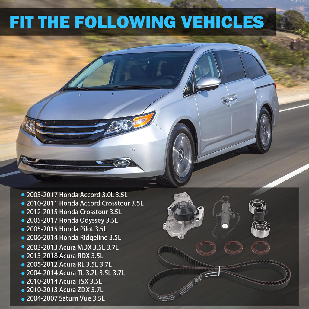 - FIT THE FOLLOWING VEHICLE - Timing belt water pump kit compatilbe with 2003-2013 Acura MDX | 2013-2018 Acura RDX | 2005-2012 Acura RL | 2004-2014 Acura TL | 2010-2014 Acura TSX | 2010-2013 Acura ZDX & 2003-2017 Honda Accord | 2010-2015 Honda Crosstour | 2005-2017 Honda Odyssey | 2005-2015 Honda Pilot | 2006-2014 Honda Ridgeline & 2004-2007 Saturn Vue.