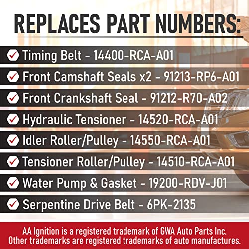 - Lifetime Warranty - This timing belt kit with water pump from AA Ignition comes complete with a lifetime warranty. If the part ever fails on your Accord Crosstour, Ridgeline, Vue, TSX, ZDX, RDX simply contact us for a replacement. Avoid yourself from headache by replacing your worn timing components and save time and money by purchasing this kit from AA Ignition.