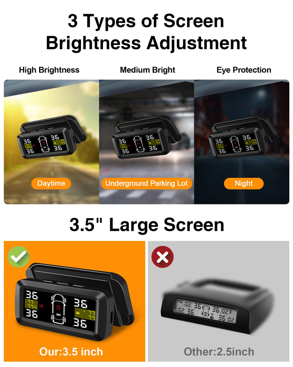 - Support Brightness Adjustment & New Generation Big Screen: Tire pressure monitor can support 3 levels of brightness manual adjustment to adapt to different driving environments, strong sunlight is clearly visible, dim parking lot and late night is not blinding.3.5 inch large screen, larger digits than the previous generation of 2.5 inch small screen, more suitable for local large car installation use.