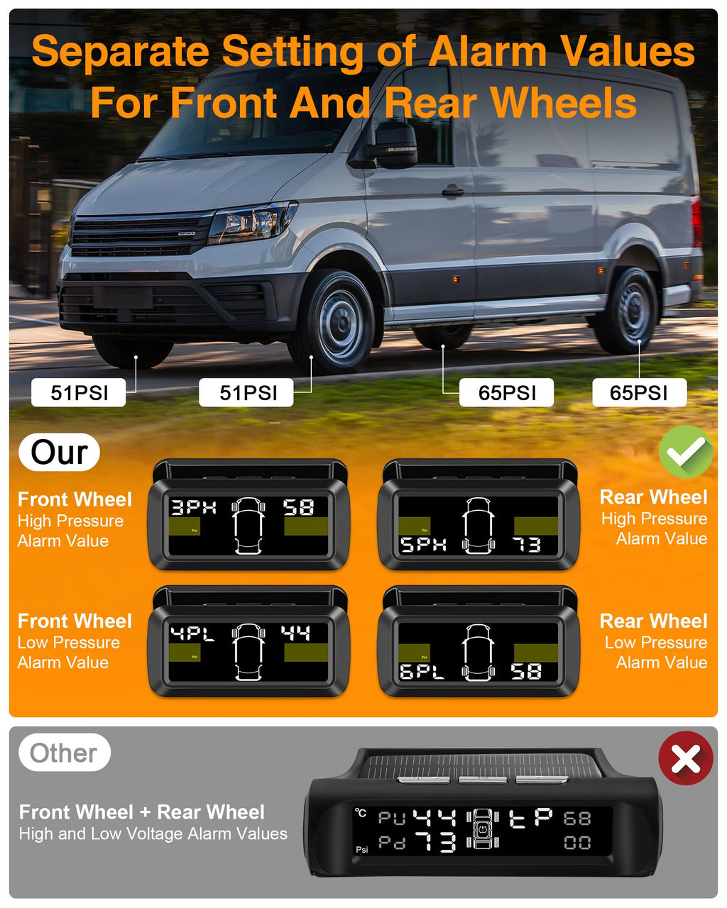 - 6 Alarm Types & Separate Setting Pressure Alarm Values: The only TPMS that supports different specifications for front and rear wheels, you can set different high and low pressure alarm values for front and rear wheels individually. You can choose between PSI or BAR (pressure) and ℉ or ℃ (temperature) with a pressure range of 0.2-6.0 bar / 3-87PSI. audible and visual alarms are provided when tire pressure and temperature are abnormal to ensure driving safety.