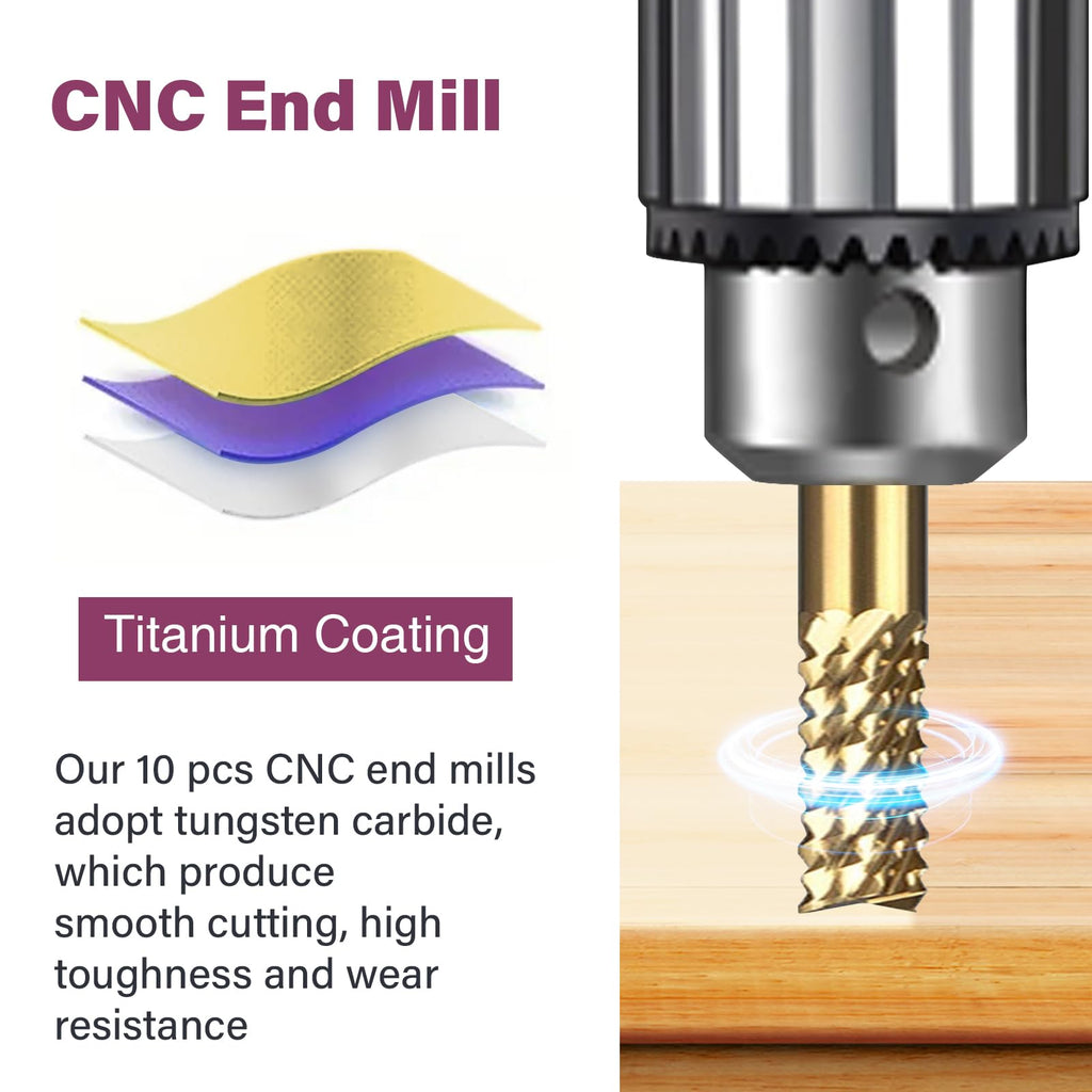 - Our carbide end mills set are Made of ultra-fine 0.2μm tungsten carbide steel alloy, which is high wear resistance and anti-impairment and can keep machining continuously more than 700 minutes.