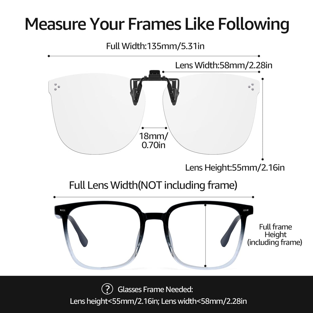 - FLIP UP & NON-FLIP UP CLIP ON GLASSES - With the flip up design of the clip on blue light blocking glasses, you can enjoy the eye protection of the blue light blocking lens easily and happily when you are working in the office by simply flipping it down. If you are the office people who spend a lot of time on electronic devices, the non-flip up on design will be your best choice.