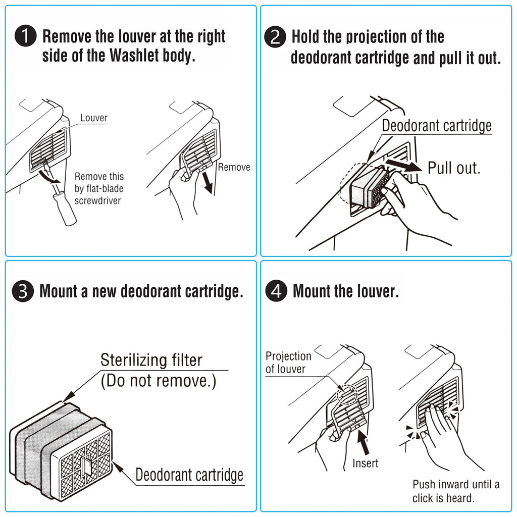 - Easy Installation: 1.Remove the louver at the rightside of the toilet body; 2.Hold the projection of the deodorant cartridge and pull it out; 3.Mount a new deodorant cartridge; 4.Mount the louver.
