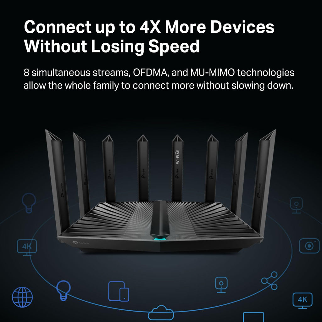 Details: Faster. Broader. Unstoppable. Archer AXE95. Onemesh. Archer AXE95 (AXE7800). WPA3. Homeshield. Ultra-fast Wi-Fi up to 7800 Mbps (Maximum wireless signal rates are the physical rates from IEEE standard 802. 11 specification. Actual wireless data throughput and wireless coverage per sq ft are not guaranteed and will vary as a result of network conditions, client limitations, and environmental factors, including building materials, obstacles, volume and density of traffic, and client location). Multi-gig internet 2.5 GBPS port. Powerful processing 1.7 GHz quad core CPU. Wi-Fi 6E Greenfield 6 GHz band. Huge Leap forward for Wi-Fi. TP-link homeshield. Wi-Fi 4. Wi-Fi 5. Wi-Fi 6. Wider high-speed lanes only for your Wi-Fi 6 E devices. Robust High-Speed Connections: Connect to an even faster Wi-Fi. The brand-new 6 GHz band is wide enough for 7 extra 160 MHz channels, preventing competition over bandwidth and drops in speed (Use of Wi-Fi 6 (802.11ax), Wi-Fi 6E, and features including OFDMA, MU-MIMO, 1024-QAM, and HE 160 require clients to also support the corresponding features. Seven 160 MHz channels may not be all available in the 6 GHz band in some regions/countries due to regulatory restrictions). Clean and Congestion-Free: The 6 GHz band is exclusive to Wi-Fi 6E devices, which prevents interference from legacy devices. Unleash the most out of the latest Wi-Fi and enjoy congestion-free networking. TP-Link's premium security services keep your home network safe with cutting-edge features for network and loT protection (HomeShield includes the free basic plan. Fees apply for the Pro plan. Visit tp-link.com/homeshield for more information). Network Protection: Detects cyber threats to keep your privacy and connected devices well protected. Quality of Service (QoS): prioritize your bandwidth needs to get a better networking experience. Parental Controls: Manage online time and block inappropriate content to maintain healthy online habits. Comprehensive Reports: Gain full statistics and insights to help you understand your home net work better. Flexible Whole-Home Wi-Fi: OneMesh is a simple way to form a Mesh network with a single Wi-Fi name for seamless whole-home coverage. Connect a OneMesh range extender to Archer AXE95 and never waste time searching for a stable connection again. Superior Connectivity: 2.5 Gbps Wan/Lan. 3x Gigabit LAN ports. Archer AXE95's 2.5 Gbps and 1 bps WAN/LAN ports offer you maximum flexibility while boosting your total internet throughput. Three gigabit LAN ports give you full control with blistering data transfer speeds for peak performance (2.5 Gbps internet speeds require compatible service plans and equiapment. 2.5 Gbps and Gigabit ports cannot be concurrentlyconfigured as wan ports). WPA3 Security: The latest Wi-Fi security protocol, WPA3, brings new capabilities to improve cybersecurity. More secure encryption in Wi-Fi password safety and enhanced protection against brute-force attacks combine to safeguard your home Wi-Fi (Use of WPA3 requires clients to also support the corresponding feature). Powerful Processing: A powerful 1.7 GHz quad -core CPU processes multiple complex tasks and demanding applications with ease. Its processing power minimizes internal latency to keep your connections fast and uninterrupted. Features: AXE7800 Wi-Fi - 7.8 Gbps tri-band Wi-Fi 6E enables gaming, streaming, and high-speed downloading on multiple devices all at the same time (Maximum wireless signal rates are the physical rates from IEEE standard 802. 11 specification. Actual wireless data throughput and wireless coverage per sq ft are not guaranteed and will vary as a result of network conditions, client limitations, and environmental factors, including building materials, obstacles, volume and density of traffic, and client location). Greenfield 6 GHz Band - Provides robust high-speed connections with a brand-new expansive and congestion-free band. Connect 100+ Devices - An advanced tri-band structure connects more devices without any drops in speed. Expansive Coverage - 8× high-performance antennas, high-power FEM, Beamforming, and 4T4R ensure broad coverage. Multi-Gig Port - The 2.5 Gbps WAN/LAN port breaks the bottleneck for multi-Gig internet and fast home NAS connections. Reduced Latency - OFDMA and DL MU-MIMO work together to serve multiple devices simultaneously and reduce lag (Use of Wi-Fi 6 (802.11ax), Wi-Fi 6E, and features including OFDMA, MU-MIMO, 1024-QAM, and HE 160 require clients to also support the corresonding features. Seven 160 MHz channels may not be all available in the 6 GHz band in some regions/countries due to regulatory restrictions). HomeShield - TP-Link's premium security services keep your home network safe with cutting-edge features for network and loT protection. Smart Connect - Intelligently assigns each device to the best Wi-Fi band for optimal performance. Easy Setup - Set up your router in minutes with the Tether app. Specifications: Wireless: 2402 Mbps (6 GHz) +