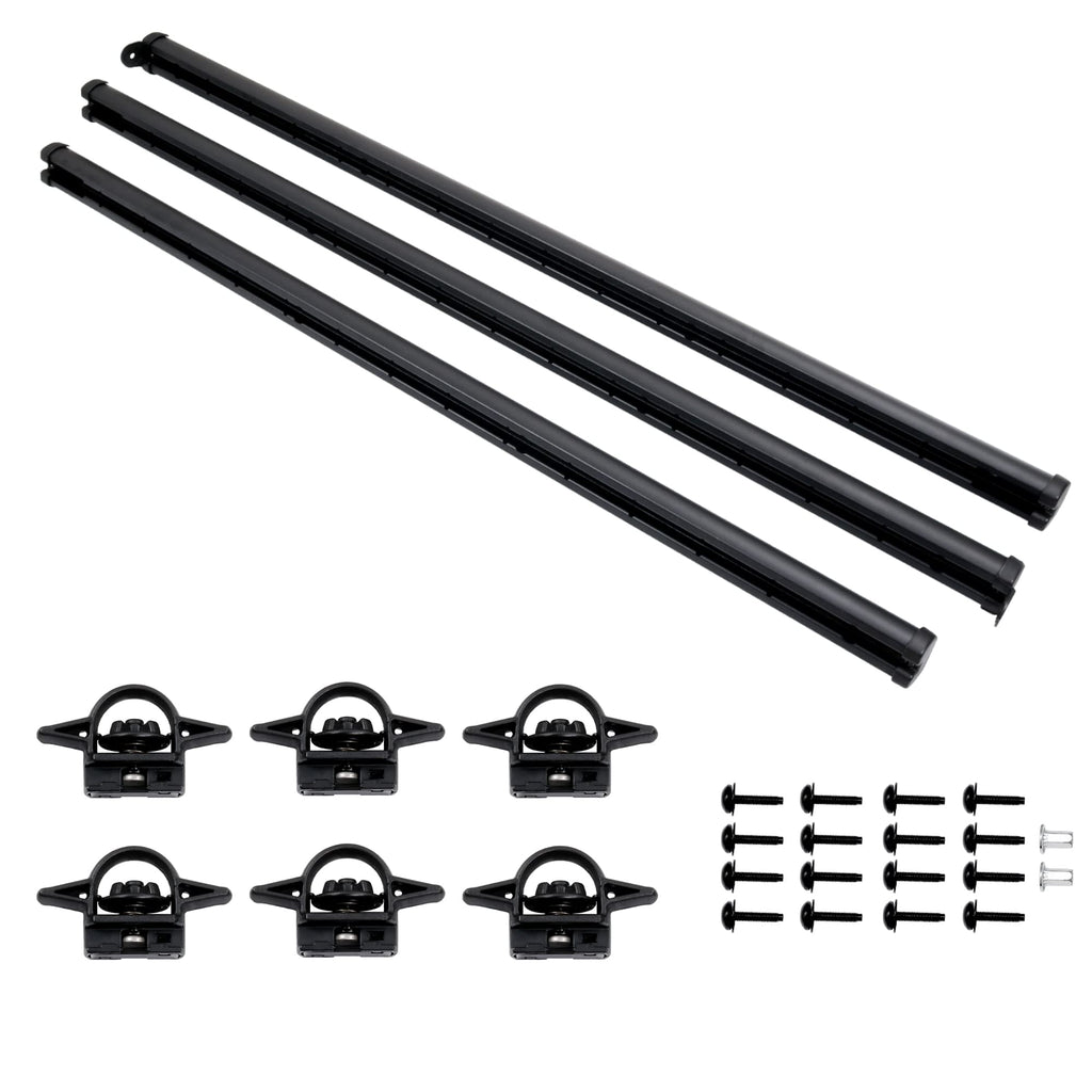 - 【Complete Kit】Our bed rail system includes 3x bed cargo rail, 6x tie down bed cleat, 16x screw, 2x M6 bolt, 1x instruction. Max recommended load is 300 lbs per rail. All Hooks install easily and do not damage the trucks bed (no drilling required).