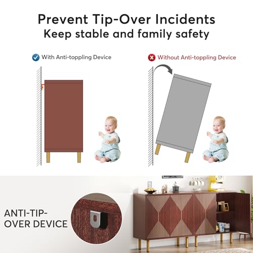 - Stable with Anti-Tip-Over Device: The buffet cabinet is mainly constructed of E1 level manufactured wood, except for the legs which are made of thick metal. This combination ensures the sideboard is sturdy and stable. Additionally, the thick metal legs provide solid support, and an anti-tip-over device enhances stability and safety, especially for children.