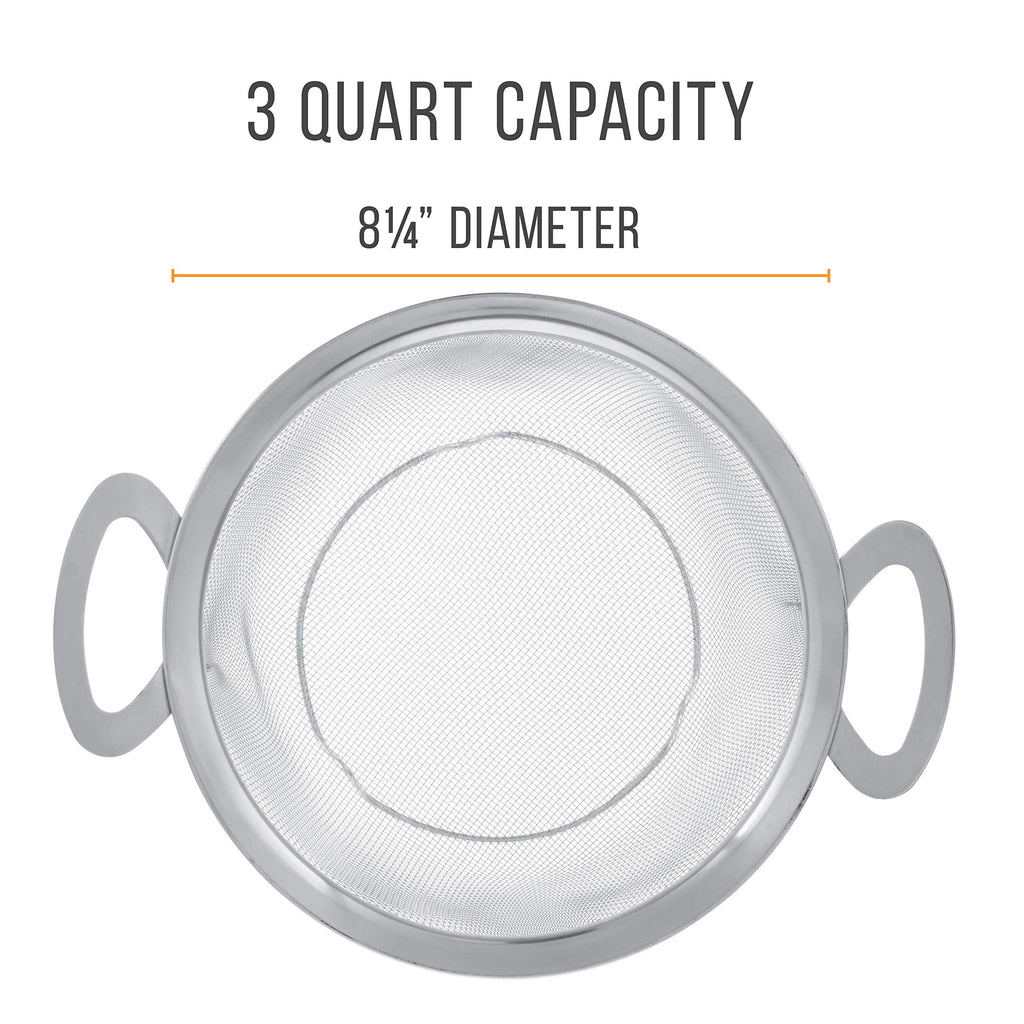 - Professional Grade Mesh Strainer Basket: A durable and sturdy high performance 3 quart (8-1/4" diameter) stainless steel mesh net strainer basket with wide handles and 3 resting feet. It features a sturdy outer mirror finished wide rimmed framework design, and has a rust-proof firm mesh strainer basket net with securely attached wide handles. This basket is built to last for a lifetime of repeated daily use.