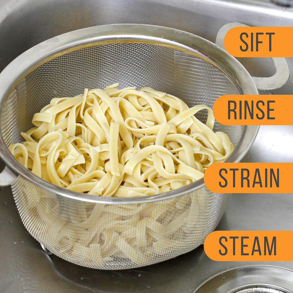 - Multiple Uses: Our colander basket strainer is great for sifting, filtering and straining out impurities and for breaking up clumps in both wet or dry ingredients. Sift flour, sugar and rice. Use for food preparation like rinsing and washing fruits, vegetables, grains and pastas. Strain thick or thin wet ingredients like sauces, lumpy gravy and broths. Use in a pot to steam vegetables, fry foods like french fries or to cook pasta. The uses are unlimited.