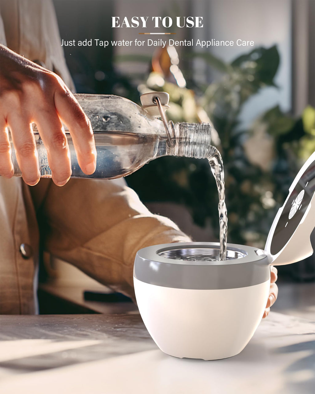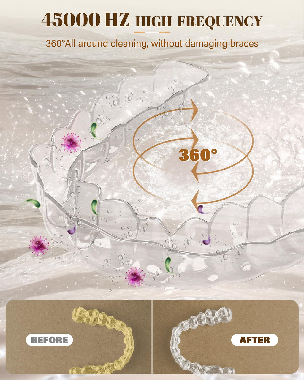 - Ultrasonic Deep Cleaning for Dental Appliances - The professional retainer cleaner utilizes 45kHz sound waves and 35W power to penetrate 360° into crevices, effectively yet gently removing particulates and dirt from dental appliances, including dentures, retainers, mouth guards, aligners, braces, whitening trays, and jewelry. Keep your personal items shiny and clean.