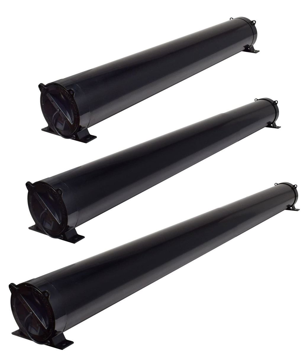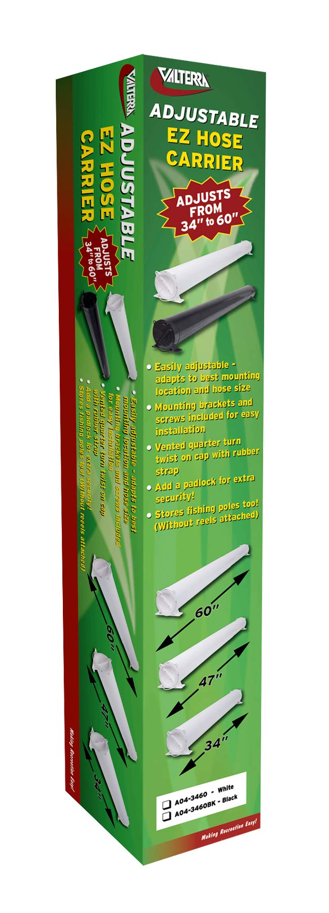 Details: Stop storing your sewer hoses in your compartments or bumpers. Try the EZ hose carrier from Valterra Products! Fits all 3" drain hoses and fittings with the exception of one-piece 90-degree sewer fittings. Inner diameter: 4.450". Comes assembled with mounting brackets for easy installation and includes self-tapping screws. Easily adjustable to adapt to the best mounting location and hose size! Comes with quarter-turn twist lock caps with straps. Both caps are vented to prevent moisture from building up in the carrier. Each cap has a loop that you can add a padlock to for extra security. Works great, especially if you're storing your expensive fishing poles (store without reels attached)!!