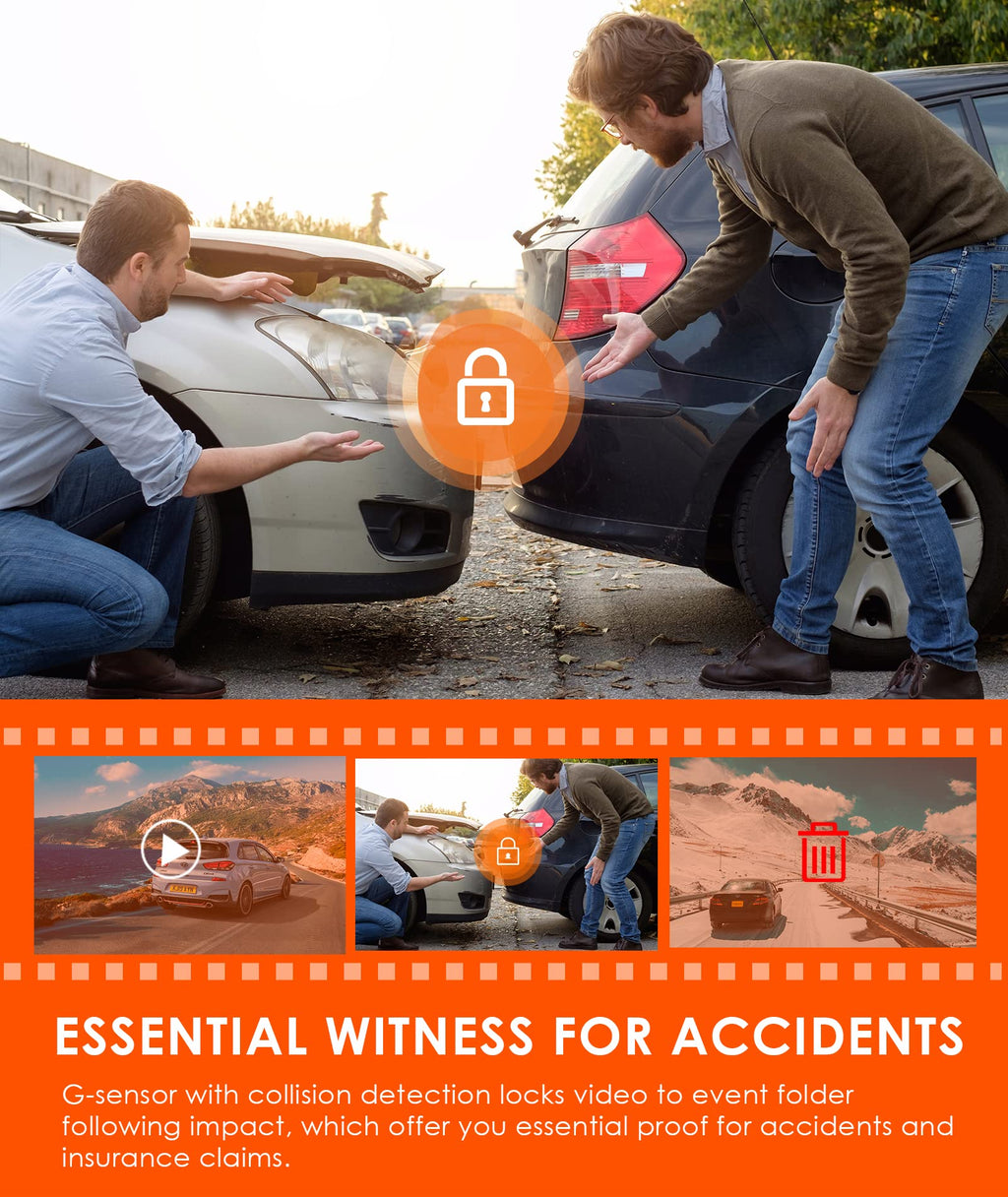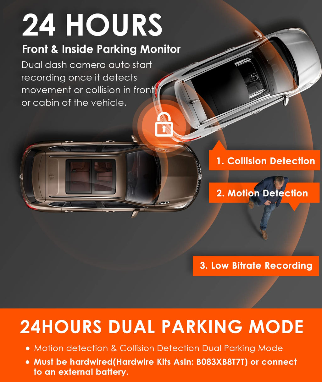 - 【24/7 Hours Parking Mode】Low Bitrate recording mode enables the dual lens dash cam to recording at 720P+720P@15fps continuously for 24 hours a day at parking mode, and the motion detection, collision detection parking mode option enables the dual car camera to start record instantly at 2.5K 2560x1440P once detects movement or collision, which greatly save the memory space and gives you a peace of mind. Please hardwire it or connect it with external battery for parking mode.
