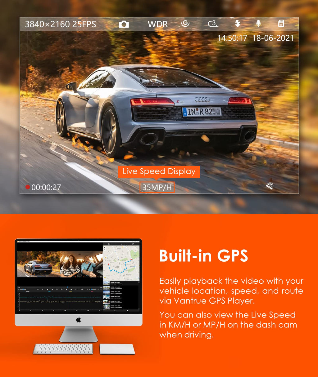 - 【4K Dash Cam with Built-in GPS 】This dual channel dash cam supports live speed view in KM/H or MP/H on your dash cam during driving. Thanks to the included GPS mount, you can also playback the video with the route, speed, and location on Google Maps via our Windows and Mac with Vantrue GPS player, which make sure the speed evidence is protected when an accident occurs.