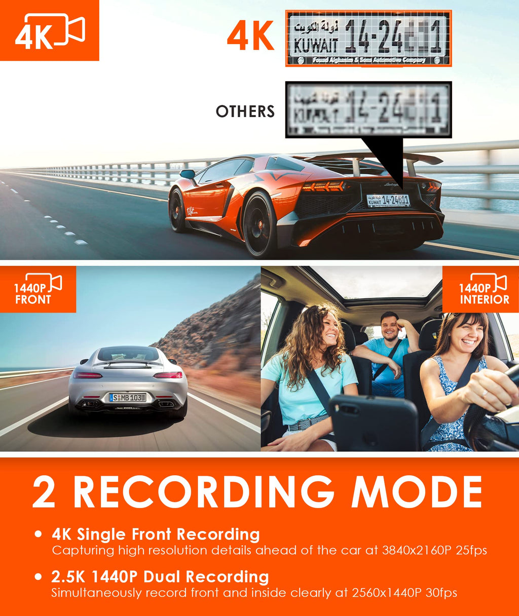- 【4K Single Front or 1440P Front and Cabin Dash Cam 】The Vantrue N2S dash cam combines the front and cabin cameras into one, helping you capture the road ahead and inside your car in 2.5K (1440P+1440P@30fps). The 4K front camera can provide you with True 4K video at 3840x2160P@25fps in single recording mode, allowing you to easily capture any key evidence such as license plates or road signs. It’s your superior choice for Uber, Lyft, Taxi, Cab, Rideshare, and must-have for family road trip!