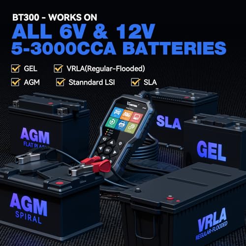 - 【WIDE COMPATIBILITY】 BT300 battery load tester works on all 6V & 12V batteries with ratings √5-3000 CCA, including Flooded lead-acid battery (VRLA or SLA)√ AGM√ GEL√ SLA√ STANDARD LSI battery for cars√ light duty trucks√ SUVs√ vans√ motorcycles√ RVs√ ATVs√ trailers√ boats√ yachts√ mowers and even golf carts. Our battery tester 12v automotive allows you quickly set CCA in ±5 or ±50 rather in only ±50. NOTE: Does NOT work on lithium batteries.