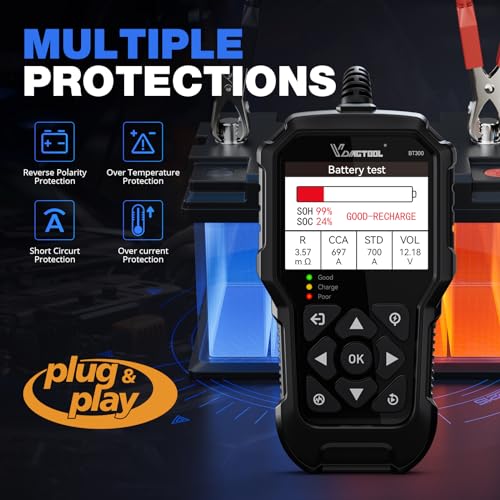 - 【6V 12V BATTERY TESTER FOR CAR MOTORCYCLE TRUCK ATV BOAT】 VDIAGTOOL BT300 is a fast & accurate car battery tester that performs literally all tests necessary to check your vehicle’s battery health conditions before it dies or a jump starter is needed, including 6V&12V Battery Test likes Voltage√ Load√ Internal Resistance√ Ripple Tests√ Rating√ SOC√ SOH√ CCA Test√ Charging & Cranking Test. It’s must-have battery testing tool for DIYers & pros.